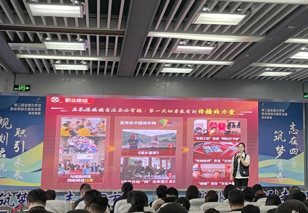 在决赛中,刘佳音与来自上海交通大学、山东大学、同济大学、湖南大学、暨南大学等众多高校学子同台竞技,她以文旅微短剧制片人身份,用《以故事讲述地方之美,用一部剧带火一座城》为题,生动讲述了其立足自身专业、致力于文旅微短剧创作的职业愿景。刘佳音总结凝练了“能掌镜、能统筹、能应变”等职业技能,用生动的案例讲述其通过学习实践不断追求职业目标的成长故事,展现出新利平台首页登录入口传媒学子对新时代媒体人使命担当的深度思考。此外,大赛总决赛组织同期活动:大学生就业创业指导课程教学交流,我校招生就业办公室黄曼琳老师作为广东三所本科高校代表之一参与活动,共同探讨生涯教育和就业创业指导服务的前沿理论与创新路径,为大学生职业发展赋能。